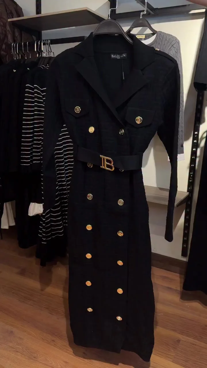 Cette robe tailleur classique à double boutonnage, confectionnée dans un tissu fluide, épouse naturellement les formes. Les boutons en métal noir et or ainsi que la ceinture « B » emblématique de la marque soulignent les détails et créent une taille précise qui met en valeur les courbes. Les épaulettes et les poches plaquées ajoutent une touche d'élégance professionnelle.
