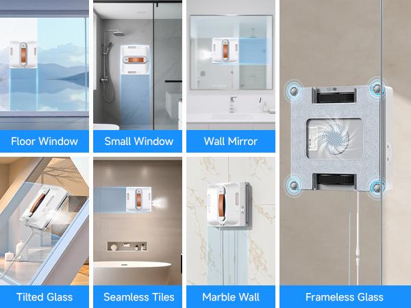 Mehrere Anwendungsbereiche Dieser Fensterreinigungsroboter eignet sich für eine Vielzahl von Oberflächen und Szenarien, z. B. für große von Boden bis zur Decke reichende Fenster, kleine Fenster, Wandspiegel, geneigte Glasflächen, nahtlose Fliesen, Marmorwände oder randloses Glas. Egal ob Wohnzimmer, Badezimmer oder andere Räume – er bewegt sich auf jeder Oberfläche mühelos.