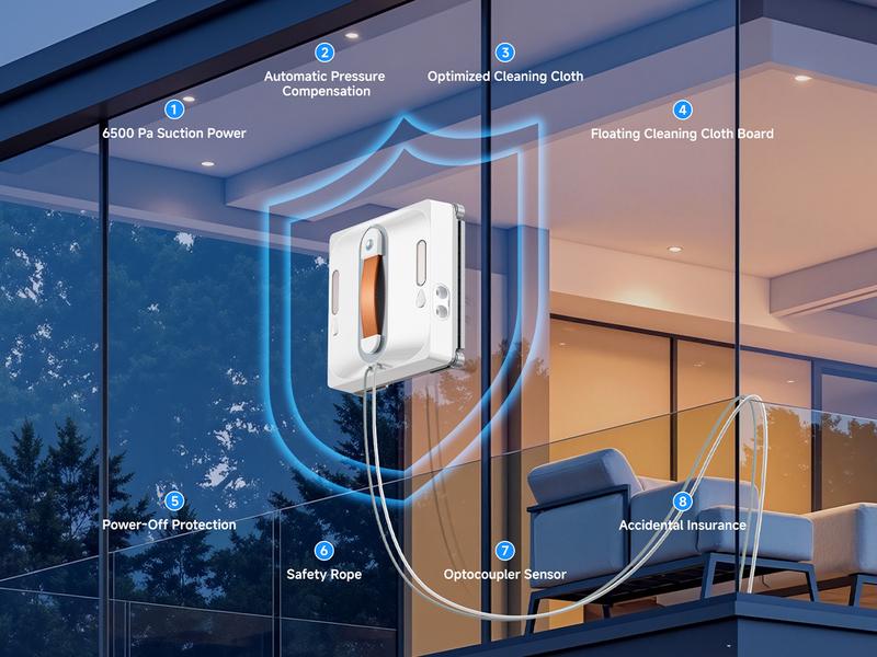 Smart Living made easy Der Fensterreinigungsroboter bringt Bequemlichkeit und Intelligenz in jedes Zuhause. Er nimmt die mühsame manuelle Fensterreinigung von Ihrer To-do-Liste, spart Zeit und Kraft, und sorgt zugleich für streifenfreie, funkelnde Fenster. Ideal für Hochhäuser, große Glasflächen oder die tägliche Hauspflege, garantiert er Sicherheit, Effizienz und ein intelligenteres Wohnerlebnis für die ganze Familie.