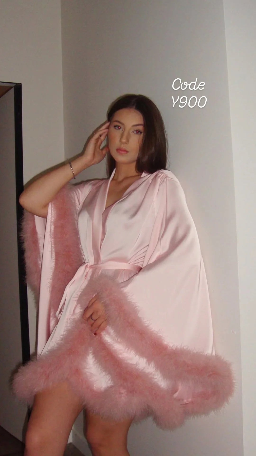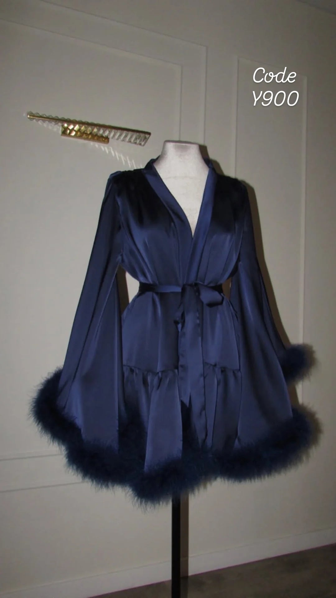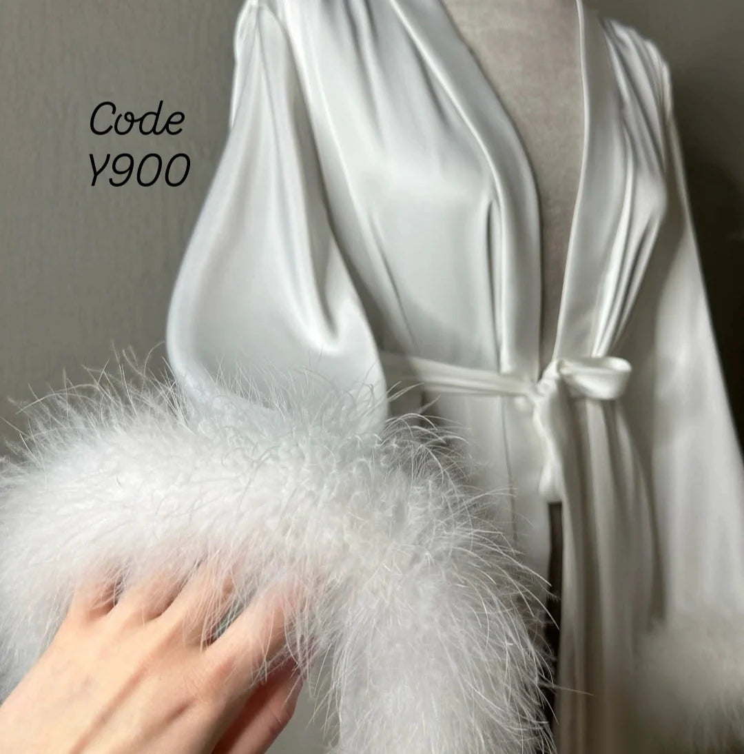 Dieser Mantel ist mehr als nur Nachtwäsche; er ist ein Statement. Der seidig glänzende Stoff umschmeichelt deine Kurven, während die üppigen Federn an den Ärmeln und am Saum für puren Glamour sorgen. Perfekt für den Hochzeitsmorgen (Getting Ready), entspannte Stunden im Boudoir oder einfach, um sich Zuhause wunderschön zu fühlen.