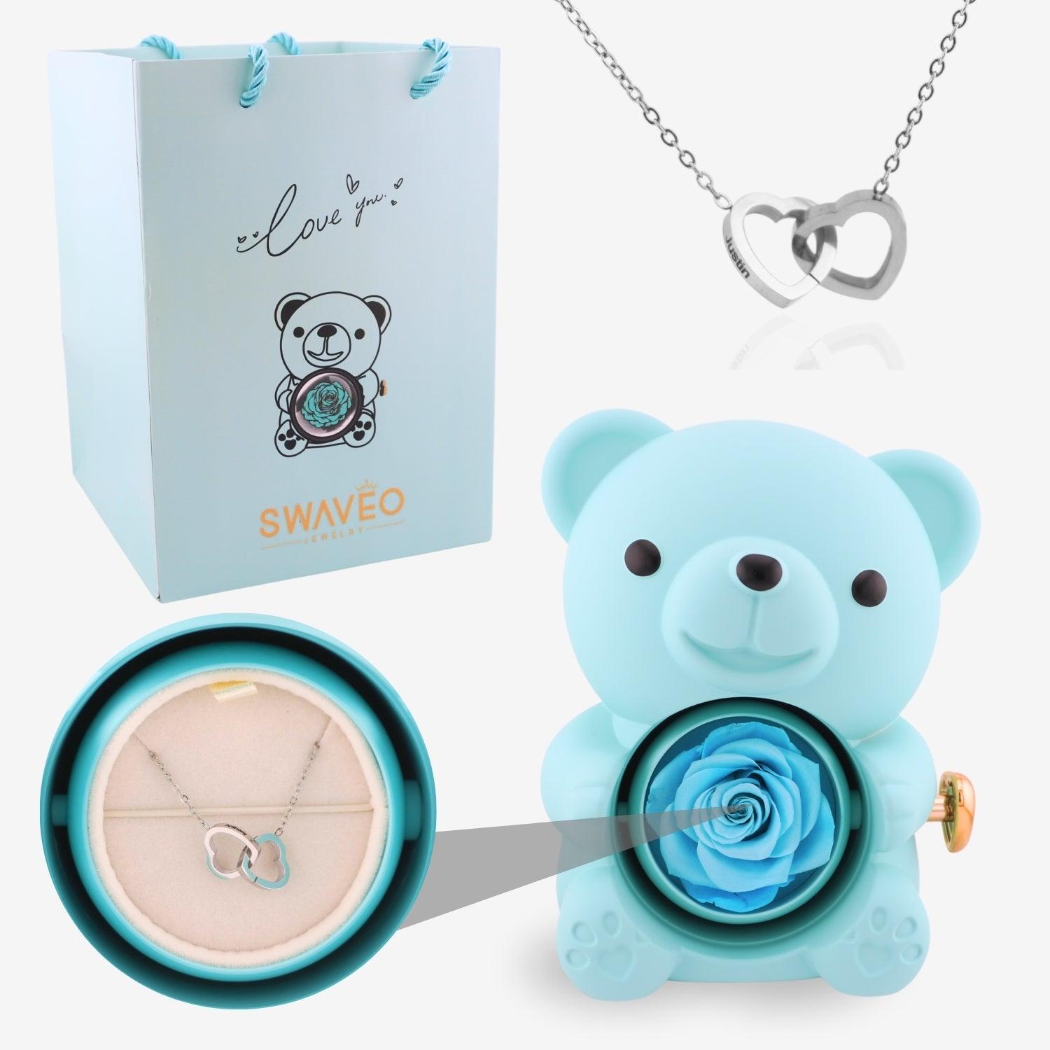 Unser Bär mit konservierter Rose ist ein bezauberndes und zeitloses Geschenk. Er enthält eine echte konservierte Rose und eine wunderschöne, 18-karätig vergoldete Halskette mit zwei ineinander verschlungenen Herzanhängern.