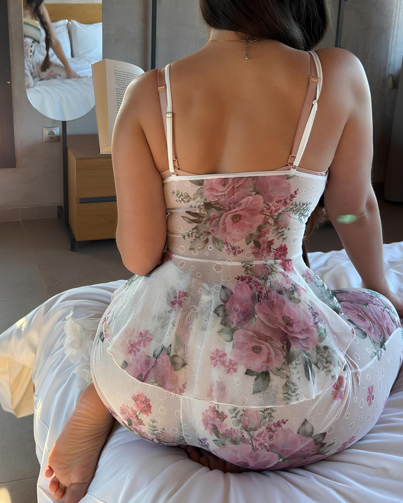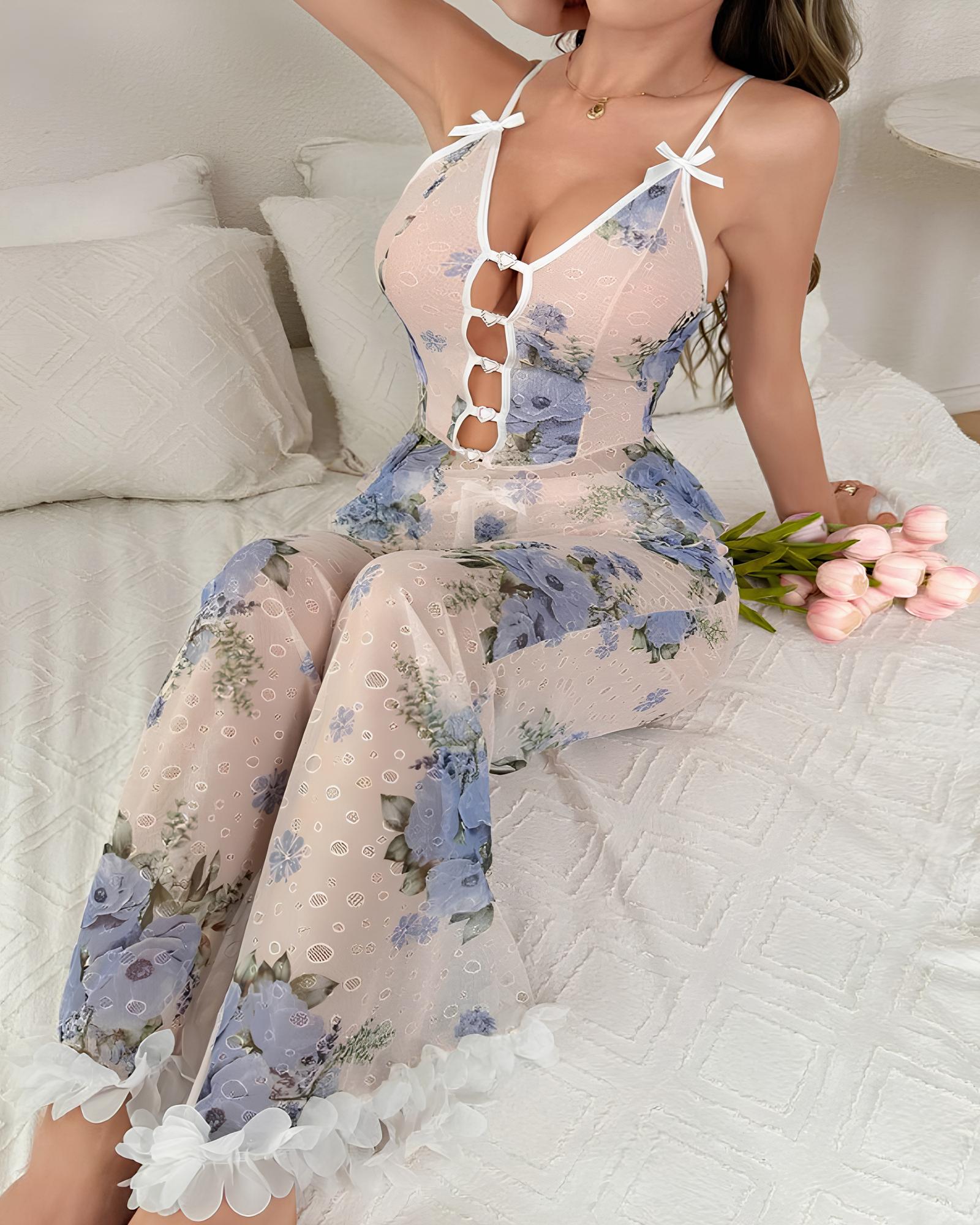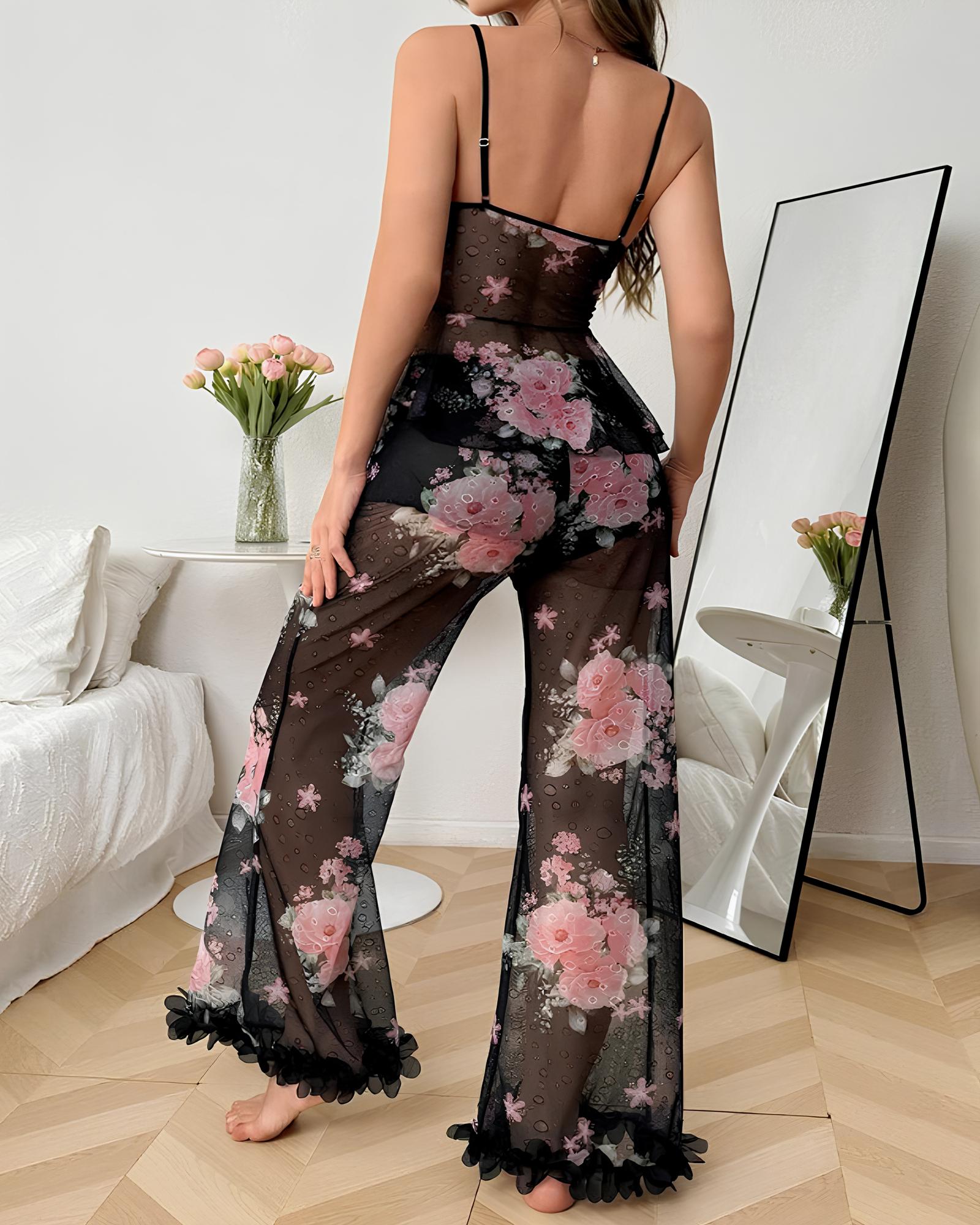 Sexy Pyjama-Set aus geblümtem, durchsichtigem Rüschen-Camisole und Hose aus Mesh