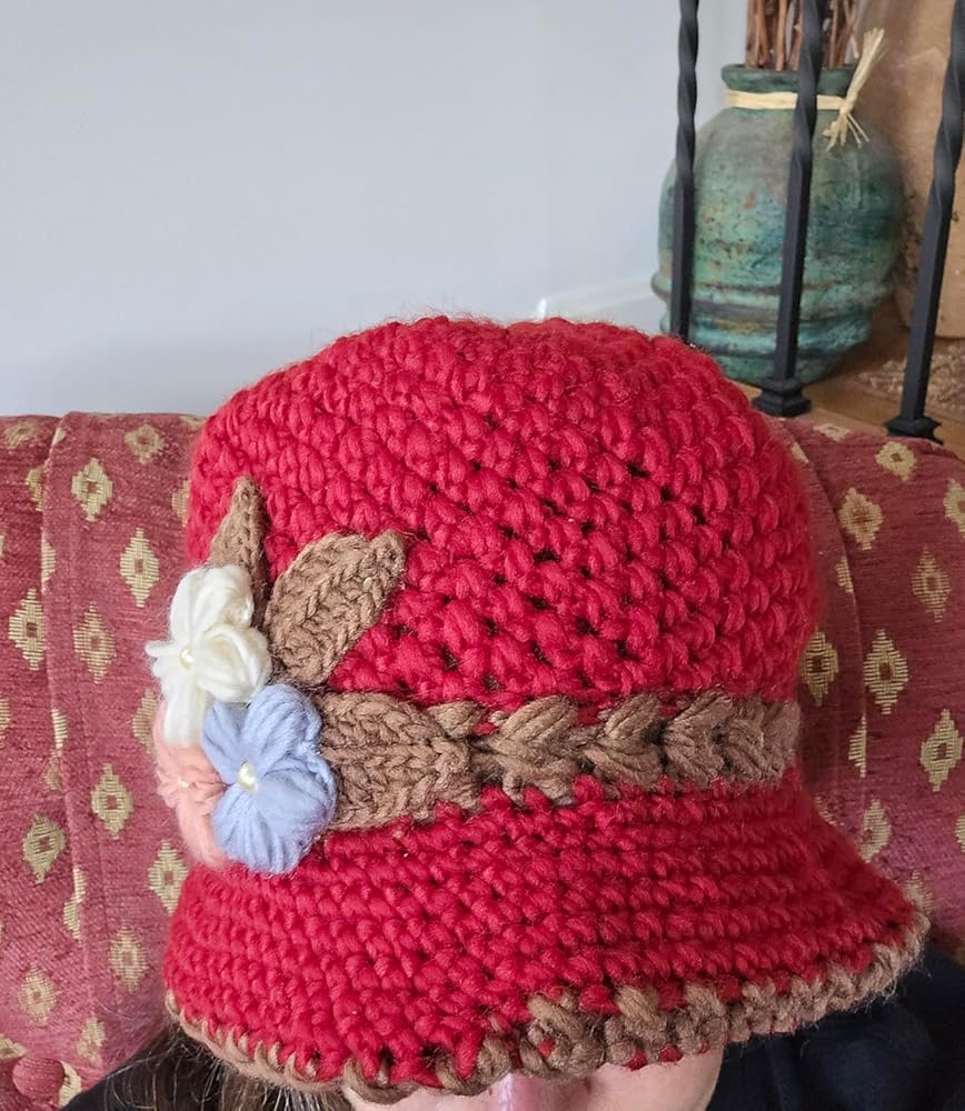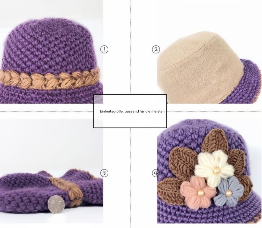 Es wurde von einer 65-jährigen Großmutter nach einer Erbstückmethode handgestrickt. Mit hervorragenden Häkelfähigkeiten verfügt diese Strickmütze über einzigartige Vintage-Blumenmuster, die Ihren Outfits einen eleganten Stil verleihen. Das perfekte Accessoire für den Alltag, Reisen, Einkaufen und Fotografieren.